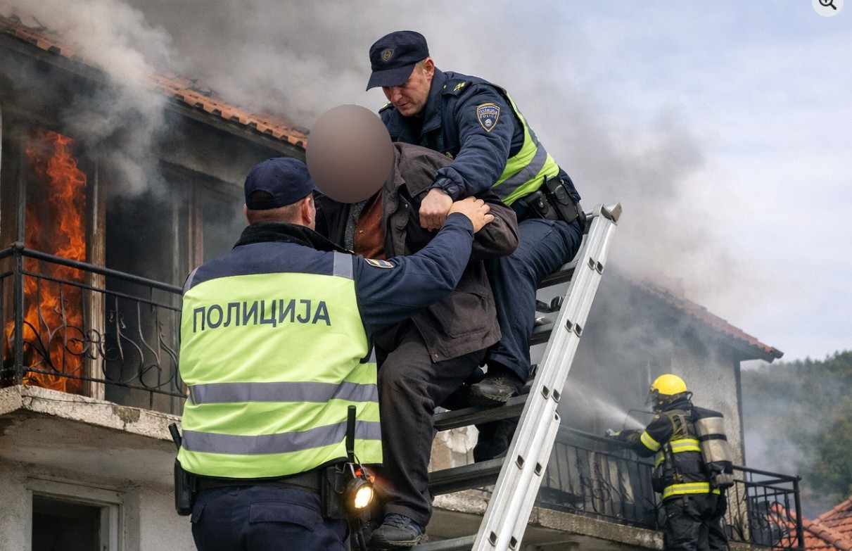 Осумдесетгодишен жител на Македонска Каменица е спасен од полициски службеници откако бил заглавен на тераса на вториот кат од својата куќа, во која избувнал пожар, соопшти Министерството за внатрешни работи.