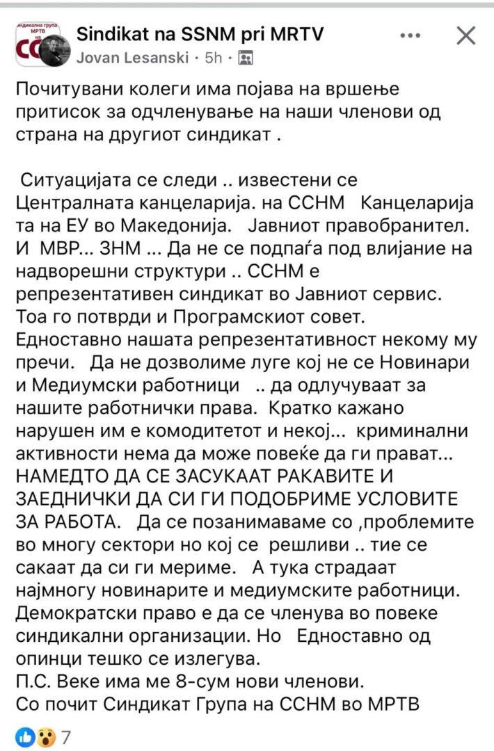 Дополнително, укажуваат дека демократијата дозволува членство во повеќе синдикални организации, но дека „единствено од опинци тешко се излегува“. Во објавата тврдат и дека веќе имаат осум нови членови.