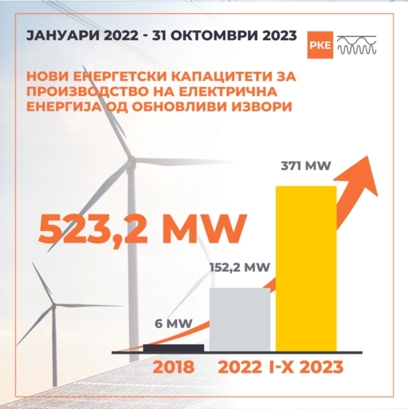За 22 месеци нови енергетски капацитети со вкупна инсталирана моќност од 523,2 МW произведуваат електрична енергија од обновливи извори, покажуваат последните податоци за издадени лиценци за периодот од јануари 2022 година – 31 октомври 2023 година, на Регулаторната комисија за енергетика, водни услуги и управување со комунален отпад (РКЕ).