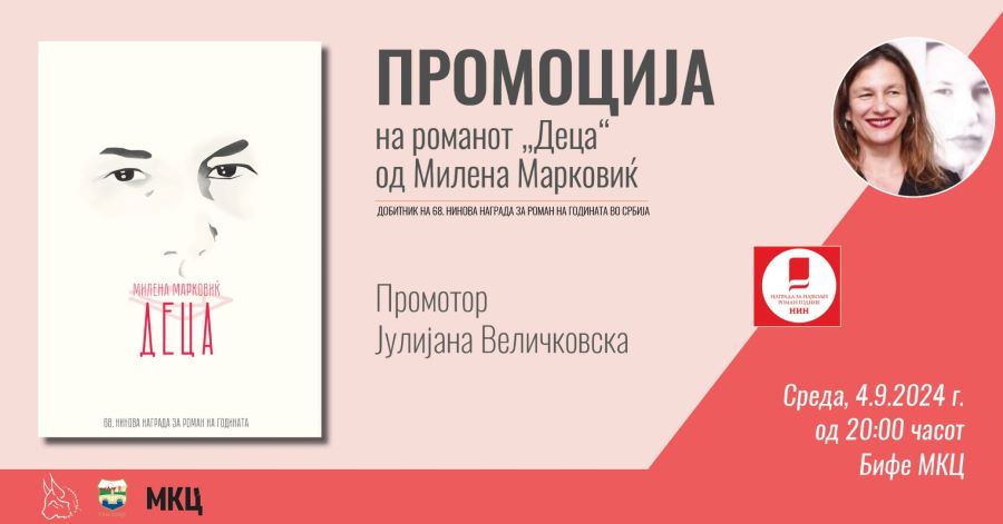 Познатата авторка на драмски текстови, сценарија и поетски книги Милена Марковиќ од Белград, денеска во Скопје ќе има промоција на нејзиниот роман „Деца“, за кој ја освои 68. НИН-ова награда за Роман на годината во Србија во 2021 година.