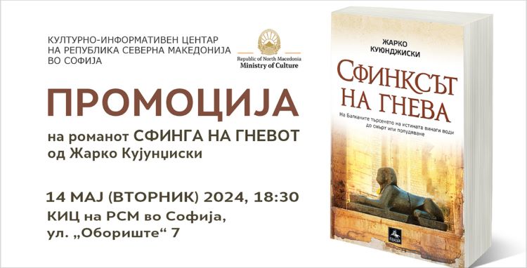 Во вторник (14 мај) од 18.30 ч. во галеријата на македонскиот Културно-информативен центар во Софија, Бугарија, на ул. „Обориште“ 7, ќе се одржи промоција на преводот на романот „Сфинга на гневот“ од македонскиот писател Жарко Кујунџиски.