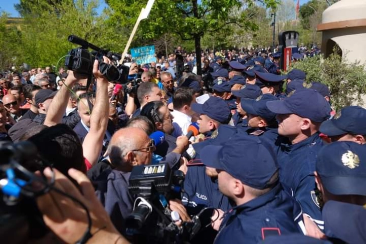 Учесниците во протестот се обидоа наслно да влезат во зградата, туркајќи го полицискиот кордон а врз објектот фрлаа со јајца и јаболка.