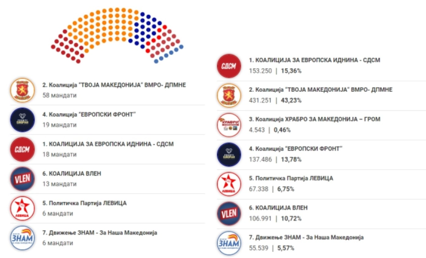 Според првичните резултати од вчерашните парламентарни избори што Државната изборна комисија ги објави утрово на својата веб-страница, од обработени над 99,27 проценти од гласовите, Коалицијата „Твоја Македонија“ на ВМРО-ДПМНЕ има освоено 431.251 (43,23%) или 58 мандати во новиот 120 член собраниски состав, Коалицијата за европска иднина предводена од СДСМ 153.250 (15,36%) – 18 пратеници, Европски фронт на ДУИ 137.486 (13,78%) – 19 пратеници, Коалицијата од албанскиот опозициски блок „Вреди“ 106.991 (10,72%) – 13 мандати,  Левица има 67.338 гласа (6,75%) – 6 пратеници, а Движење ЗНАМ – За наша Македонија 55.539 (5,57%) – 6 пратеници. Останатите партии и коалиции кои учествуваа на изборите имаат под еден процент гласови.