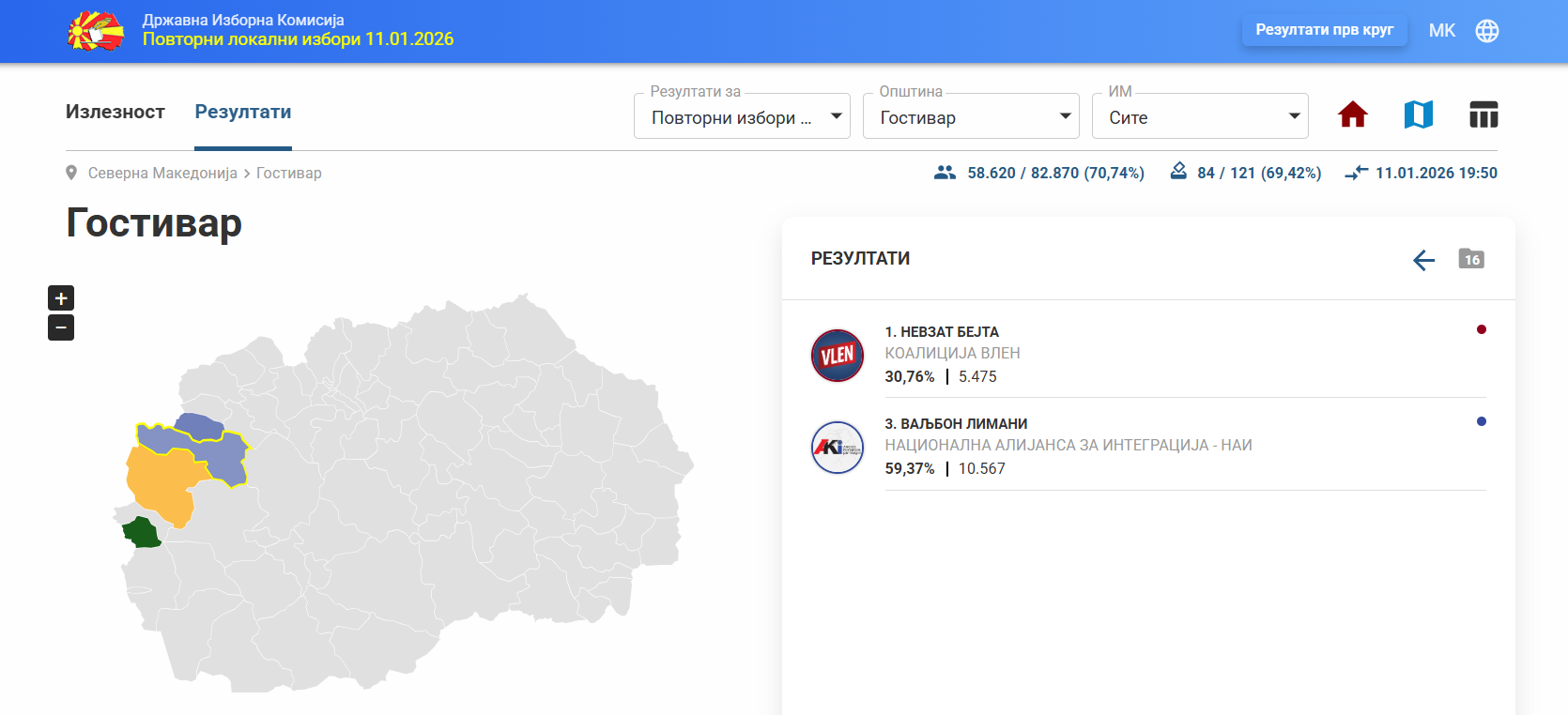 По пребројани 69,42% од гласовите во Гостивар убедливо води кандидатот на коалицијата предводена од ДУИ, Валбон Лимани кој има освои 10.597 гласа или речиси двојно повеќе од кандидатот на ВЛЕН Неват Бејта кој има 5.475 гласа.