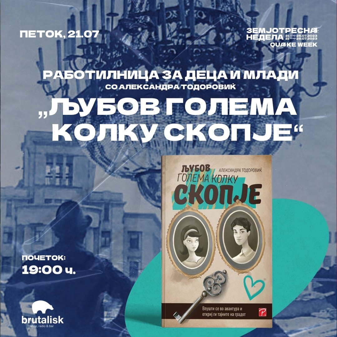 На 21 јули од 19 до 20:30 часот, во „Бруталиск“ ќе се одржи едукативна работилница за деца и млади во која тие преку различни забавни и креативни активности (игри со временски капсули, пишување на стари писма, разгледби на Скопје пред земјотресот) ќе го видат градот со поинакви очи.