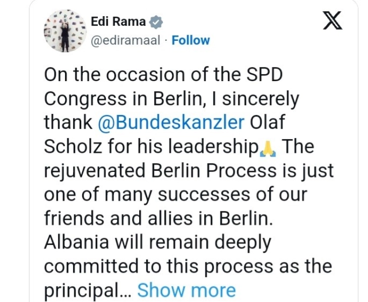 Албанскиот премиер Еди Рама преку објава на социјалните мрежи порача дека обновениот Берлински процес е само еден од многуте успеси на пријателите и сојузниците во Берлин.