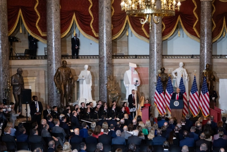 На церемонијалниот собир во американскиот Конгрес, кој повеќе од 70 години ги собира пратениците и од демократите и од републиканците за да промовираат единство, Трамп рече дека „вистински верува“ дека луѓето „не можат да бидат среќни без религија и верување“.