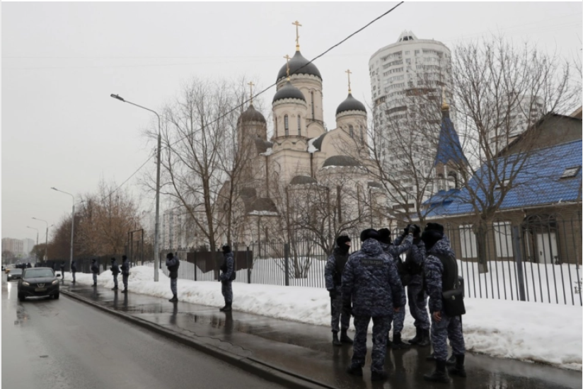 Метални огради беа поставени околу голема површина пред почетокот на церемонијата на московската црква и гробишта, а десетици возила за итна помош и униформирани службеници зазедоа позиции од рано утрото.