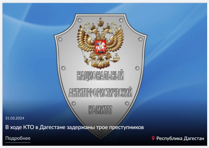 Претходно објави дека безбедносните служби блокирале осомничени криминалци во неколку станови во станбените квартови на регионалниот главен глад Махачкала и во еден од најголемите градови во каспискиот регион.