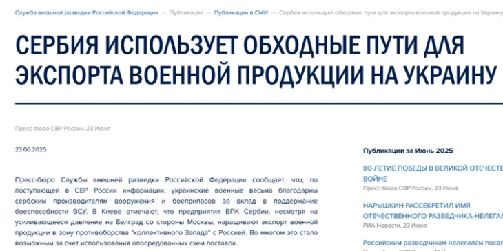 На крајот на мај оваа година, СВР ја обвини Србија дека продолжува да ја снабдува Украина со муниција, наведувајќи дека целта на тие испораки била „да се убијат и осакатат руски војници и цивили“. Во остра изјава насловена како „Србија се обидува да пука во Русија во грб“, која ја објави на својата веб-страница, руската служба наведува дека лажните сертификати за крајни корисници се користат како покритие за антируски активности. и посреднички земји, односно да продаваат муниција на Киев за време на војната во Украина.