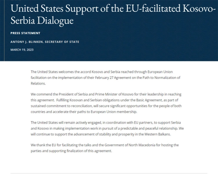 „Ги пофалуваме претседателот на Србија и премиерот на Косово за нивното лидерство во постигнувањето договор. Исполнувањето на обврските на Косово и Србија од Основниот договор, во рамките на трајната определба за помирување, ќе обезбеди значителни можности за граѓаните на двете земји и да го забрзаат нивниот пат кон членство во Европската унија“, се вели во соопштението на американскиот државен секретар Ентони Блинкен.