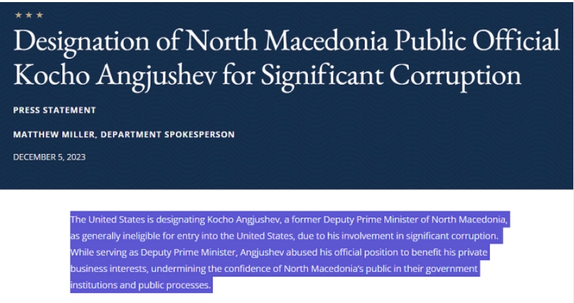 – Додека ја извршуваше функцијата вицепремиер, Анѓушев ја злоупотреби својата службена положба во корист на неговите приватни деловни интереси, поткопувајќи ја довербата на јавноста во Северна Македонија во нивните владини институции и јавни процеси, се наведува во соопштението објавено од Стејт департментот.