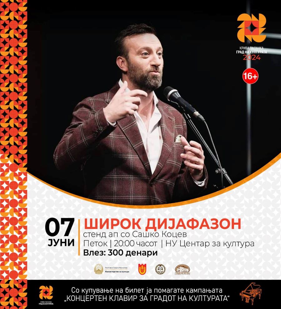 Сашко Коцев ќе гостува  со својот стендап „Широк дијафазон“  во НУ Центар за култура Крива Паланка, на 7 јуни (петок), со почеток во 20,00 часот.