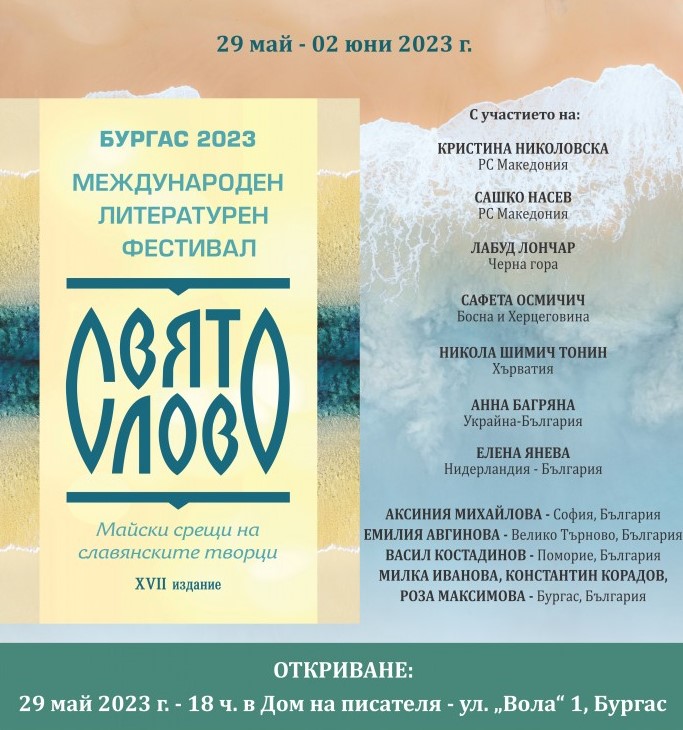 Писатели од неколку европски земји, меѓу кои и македонските автори Сашко Насев и Кристина Николовска, од денеска до 2 јуни ќе учествуваат на 17. Меѓународен литературен фестивал „Свето слово“ – Мајски средби на словенските уметници, што ќе се одржи во бугарскиот приморски град Бургас.