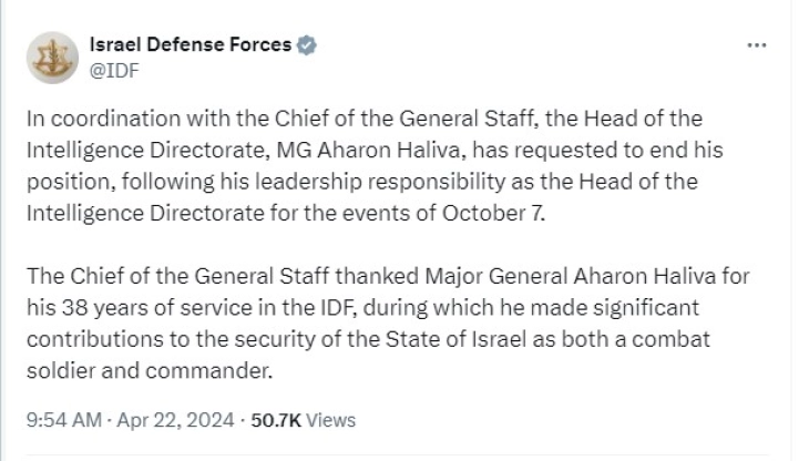 „Во координација со началникот на Генералштабот, началникот на Управата за разузнавање, генерал-мајор Ахарон Халива, побара да ја прекине функцијата, по неговата лидерска одговорност како началник на Управата за разузнавање за настаните од 7 октомври.