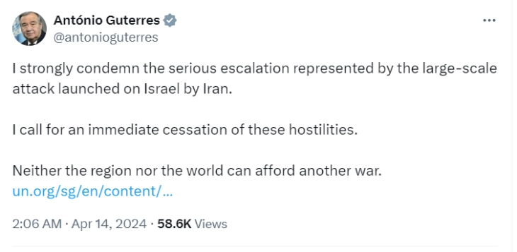 Генералниот секретар на ОН, Антонио Гутереш „силно ја осуди сериозната ескалација претставена со големиот напад на Израел од страна на Исламската Република Иран и повика на итен прекин на непријателствата.