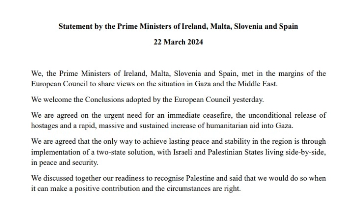 – Се согласуваме дека единствениот начин да се постигне траен мир и стабилност во регионот е преку имплементација на решение за две држави, при што израелската и палестинската држава ќе живеат рамо до рамо, во мир и безбедност, се вели во заедничката изјава на премиерите на Ирска, Малта, Словенија и Шпанија.