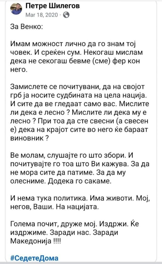 Во објава на Фејсбук, прикажана на сликата и датирана на 18 март 2020 година, Петре Шилегов пишува со силна лична поддршка за Венко Филипче.