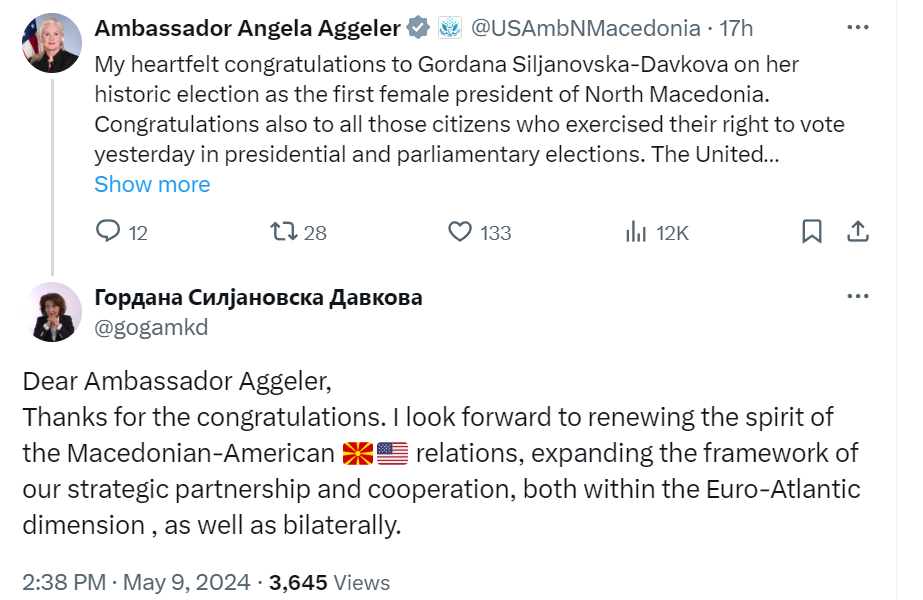 -Моите срдечни честитки до Гордана Сиљановска Давкова за нејзиниот историски избор за прва жена претседател на Северна Македонија. Честитки и за сите оние граѓани кои вчера го искористија своето избирачко право на претседателски и парламентарни избори. Соединетите Американски Држави ќе продолжат да ги поддржуваат целите за просперитет и целосна евроатланска интеграција на оваа земја, стои во пораката на Агелер.