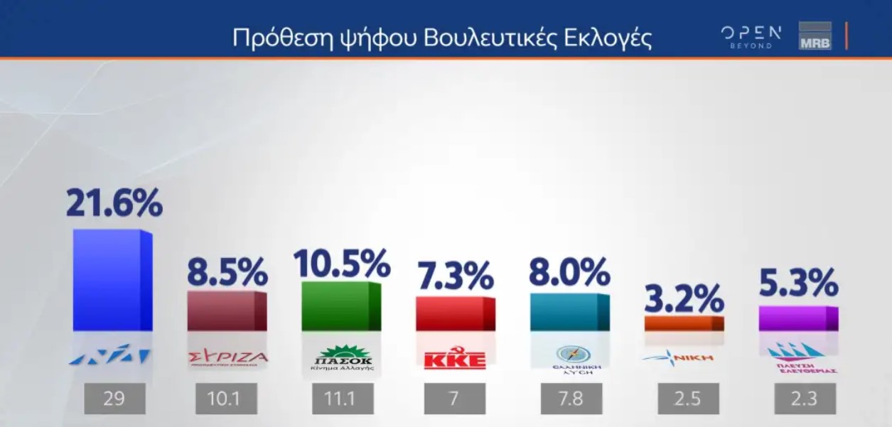 Според последното истражување на јавното мислење во Грција објавено минатата седмица Нова демократија останува главна политичка сила во земјата, а ПАСОК успева да ја „симне“ СИРИЗА од втората позиција и добива 10,5 отсто, а зад неа, како трета политичка сила со два проценти помалку е СИРИЗА.