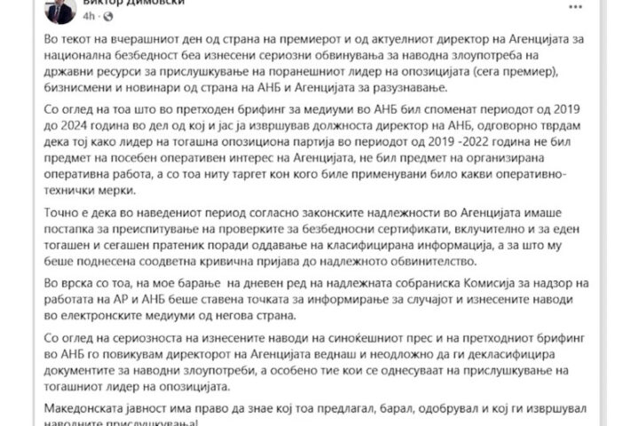 Поранешниот прв разузнувач Виктор Димовски ги отфрли обвинувањата на премиерот Христијан Мицкоски, дека бил прислушуван. Тој на својот фб порача дека Мицкоски не бил прислушкуван во време додека тој бил директор на АНБ. Ваквата информација доаѓа откако вчера актуелниот дикректор Бојан Христовски рече дека Мицкоски бил прислушуван. Димовски денеска, на својот профил на фејсбук го … Продолжи со читање Поранешниот прв разузнувач Димовски бара Христовски да ги отвори тајните досиеа, Мицкоски никогаш не бил прислушуван
