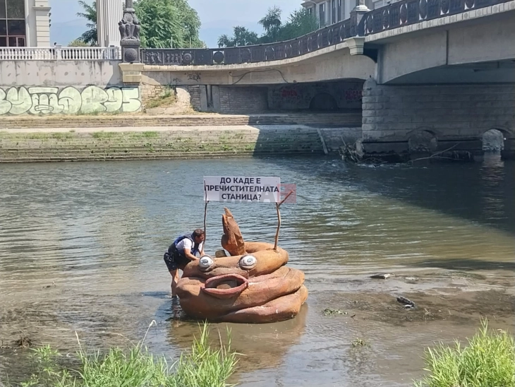 Активистот Никола Писарев од Центарот за современи уметности постави протестно уметничка скулптурална акција во реката Вардар и претставува повик кон властите за конечно почнување со изградба на пречистителна станица во Вардар.
