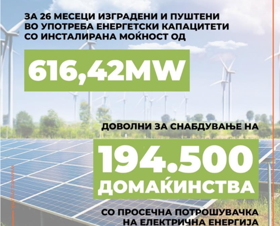 Новите енергетски капацитети со инсталирана моќност од 616,42 MW што произведуваат струја од обновливи извори се доволни за потребите на 194,5 илјади домаќинства со просечна потрошувачка на електрична енергија.