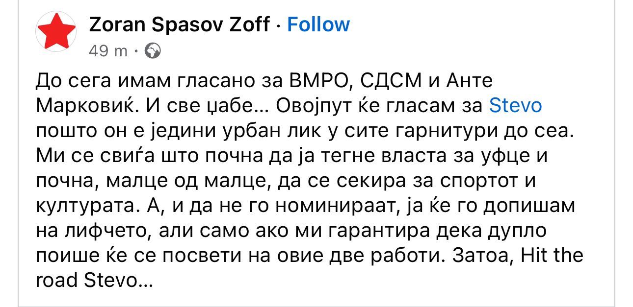 „До сега имам гласано за ВМРО, СДСМ и Анте Марковиќ. И све џабе… Овојпут ќе гласам за Стево пошто он е једини урбан лик у сите гарнитури до сеа“, напиша на социјалните мрежи бизнисменот и писател Зоран Спасов-Ѕоф изразувајќи поддршка за втор мандат за претседателот Стево Пендаровски.