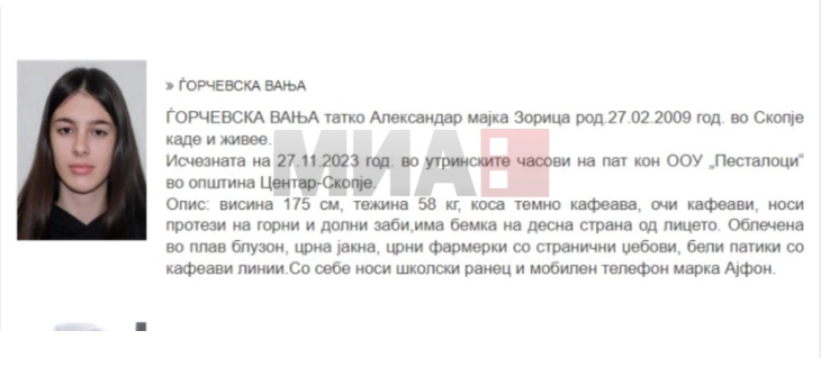 Веќе шест дена се трага по Вања Ѓорчевска која исчезна во понеделникот во период по 7.20 часот, на пат кон училиштето Песталоци во близина на Дебар Маало. Последен пат била забележана на булеварот Партизански одреди пред „Броз кафе“, од каде што ѝ се губи трагата. Во изминатиот период, на барање на Министерството за внатрешни работи распишана е меѓународна потерница за ичезнатото девојче од страна на Интерпол.