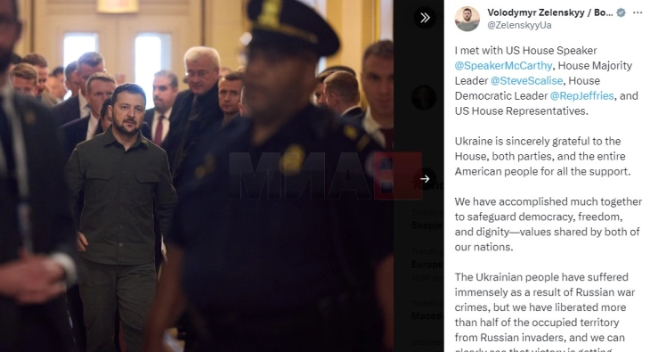 – Украина е искрено благодарна на американскиот Претставнички дом, на двете партии и на целиот американски народ за сета поддршка. Заедно постигнавме многу за да ги заштитиме демократијата, слободата и достоинството – вредности што ги споделуваат и двете нации. Украинскиот народ неизмерно страдаше како резултат на руските воени злосторства, но ние ослободивме повеќе од половина од окупираната територија од руските напаѓачи и јасно можеме да видиме дека победата е сè поблиску, напиша Зеленски на Х после средбите.
