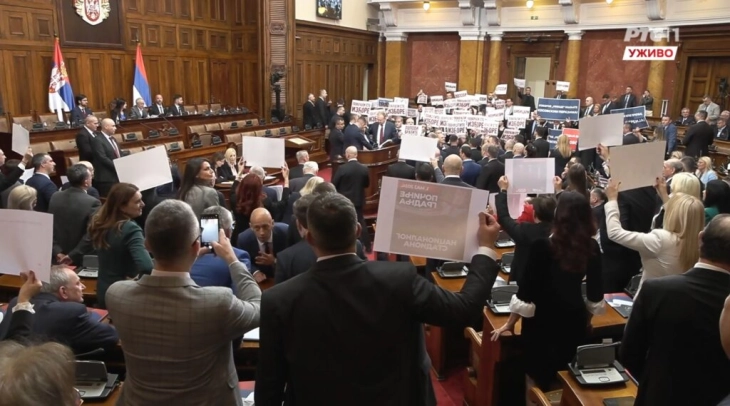 Опозициската партија „Србија против насилството“ по полагање на заклетва во холот на собранието излезе со став дека „ја натерале владеачката СНС да ја прекине конститутивната седница“, додека владеачките партии го осудија „недоличното однесување на опозицијата“, јави дописникот на МИА од Белград.