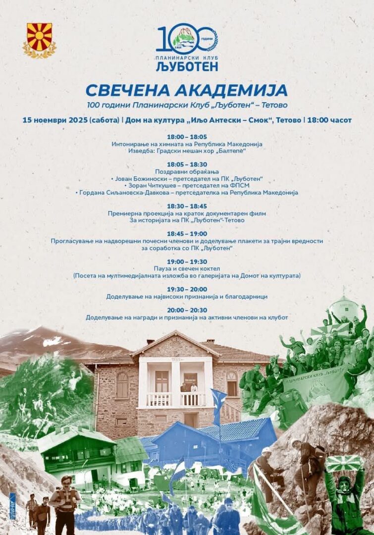 Под слоганот „100 години вредности за 100 години иднина“ на 15 ноември 2025 година, во Домот на култура „Иљо Антески – Смок“ во Тетово, ќе се одржи Свечената академија по повод 100 години од основањето на Планинарскиот клуб „Љуботен“.Настанот претставува централна прослава на вековното постоење на најстариот планинарски клуб во Македонија, симбол на истрајност, колективен дух и трајна љубов кон планината.