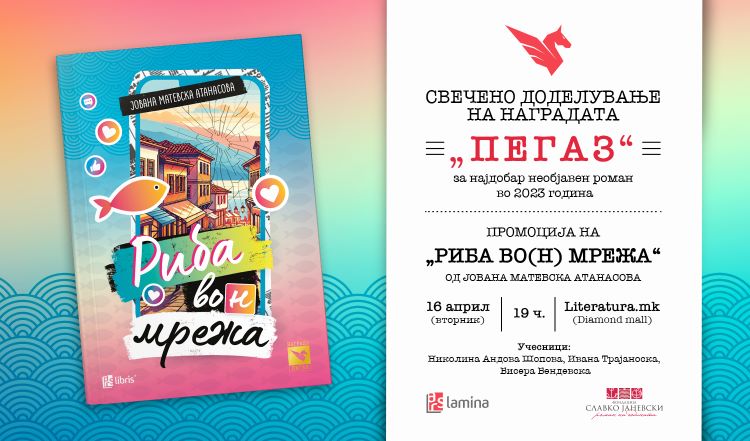 Свеченото доделување на наградата „Пегаз“ за 2023 година и промоцијата на победничкиот роман – „Риба во(н) мрежа“ од авторката Јована Матевска Атанасова ќе се одржат на 16 април (вторник), со почеток во 19 часот, во книжарницата „Литература.мк“ во „Дајмонд мол“.