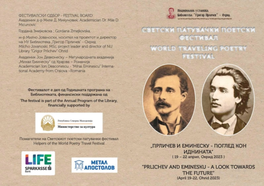 Во организација на Националната установа Библиотека „Григор Прличев“ од Охрид и Меѓународната академија „Михаи Еминеску“ од романскиот град Крајова од денеска до 22 април во Охрид ќе се одржува Светскиот поетски патувачки фестивал „Прличев и Еминеску – поглед кон иднината“.