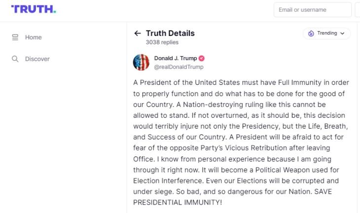 – Претседателот на САД мора да има целосен имунитет за да може да го направи она што е добро за нашата земја. Не смее да се дозволи оваа пресуда што ја уништува американската нација да остане во сила, напиша Трамп на својата социјална мрежа TruthSocial.