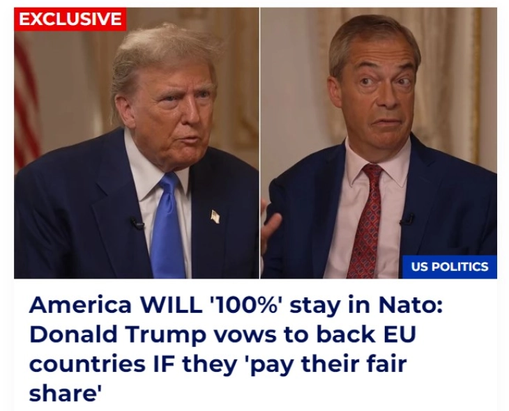 Во интервју за Џи-Би Њуз (GB News), Трамп ги осуди земјите од ЕУ за „искористување на (актуелната) ситуација“ и им рече да платат доколку сакаат загарантирана поддршка од САД.