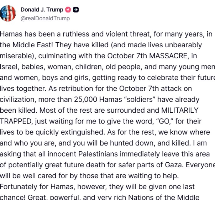 „Хамас е немилосрдна и насилна закана на Блискиот Исток со години! Тие убиваат (и го прават животот неподнослив), што кулминира со МАСАКРОТ на 7 октомври во Израел – бебиња, жени, деца, стари лица и многу млади мажи и жени, момчиња и девојчиња кои се подготвуваа да го прослават својот иден живот заедно. Како одмазда за нападот врз цивилизацијата на 7 октомври, повеќе од 25.000 „војници“ на Хамас веќе се убиени. Повеќето од другите се опкружени и воено опколени, тие само чекаат да им го кажам зборот „ОДИ“ за брзо да им се згасне животот“, наведува Трамп во својата остра објава до палестинската милитантна група.