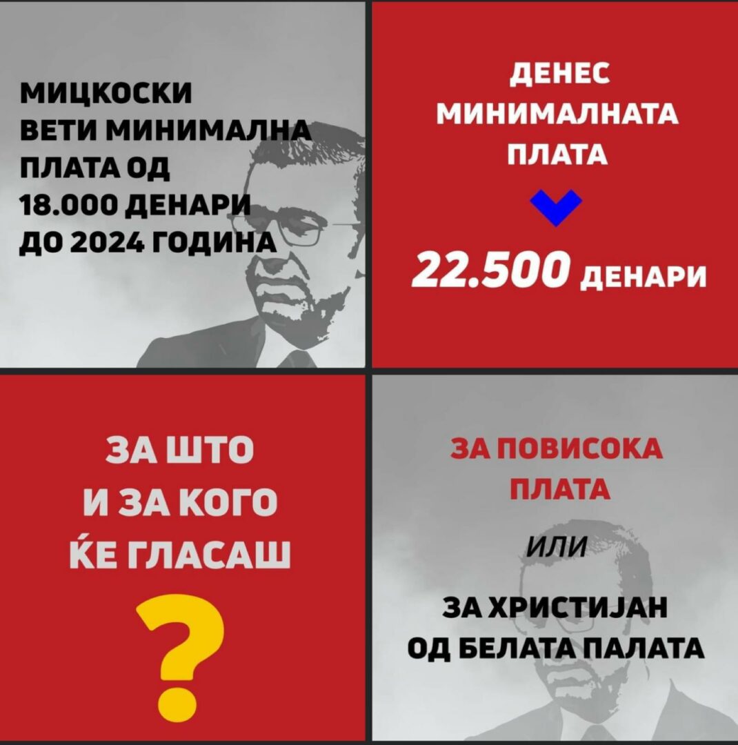 Пред изборите во 2020 година ветувањето на ВМРО-ДПМНЕ и Христијан Мицкоски беше дека доколку тие се власт, минималната плата во 2024 година ќе изнесува 18 илјади денари.