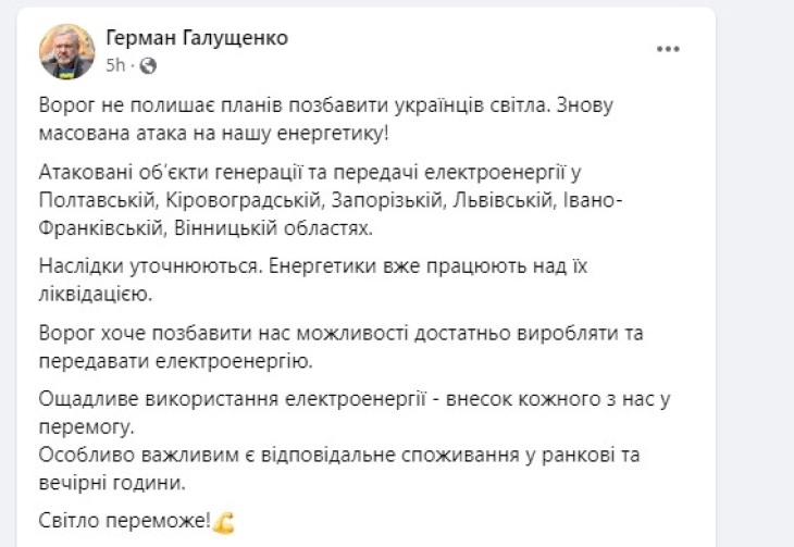 Украинскиот министер за енергетика Герман Галушченко утринава соопшти дека руските сили во текот на претходната ноќ извршиле нов „масовен напад со проектили и беспилотни летала“ врз украинската енергетска инфраструктура, во кој се повредени најмалку шест лица.
