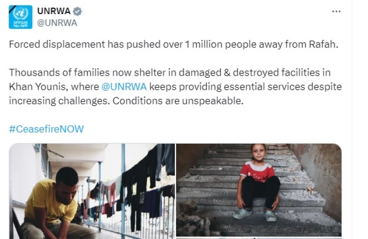 УНРВА соопшти дека илјадници семејства сега се засолниле во оштетените и уништени објекти во градот Кан Јунис, каде што агенцијата обезбедува основни услуги и покрај „сè поголемите предизвици“.