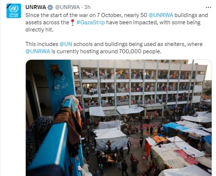 „Ова ги вклучува училиштата и зградите на ОН кои се користат како засолништа, каде што УНРВА моментално сместува околу 700.000 луѓе“, соопшти УНРВА на социјалните мрежи.Канцеларијата на Обединетите нации за координација на хуманитарни прашања (OCHA) претходно денеска информираше дека во вчерашните израелски напади загинале најмалку 23 лица, кои се криеле во засолништата на УНРВА, каде има околу 20.000 раселени лица во Газа. Од 7 октомври, 72 членови на УНРВА се убиени во Газа.