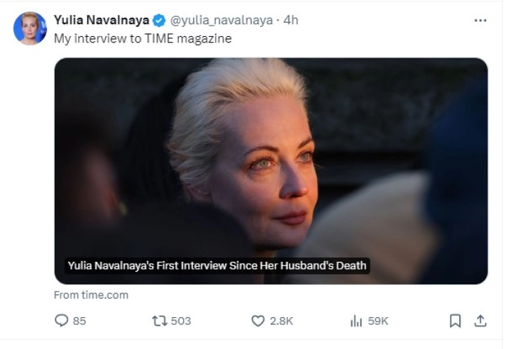 Таа во интервју за денешното издание на магазинот „Тајм“ нагласи дека нападот на блискиот соработник на Алексеј Навални, Леонид Волков, ја натерал да го зголеми нивото на лична безбедност.
