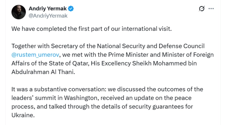 Јермак информира дека тој и Умеров се сретнале и со премиерот и министерот за надворешни работи на Катар, Мохамед бин Абдулрахман Ал Тани.