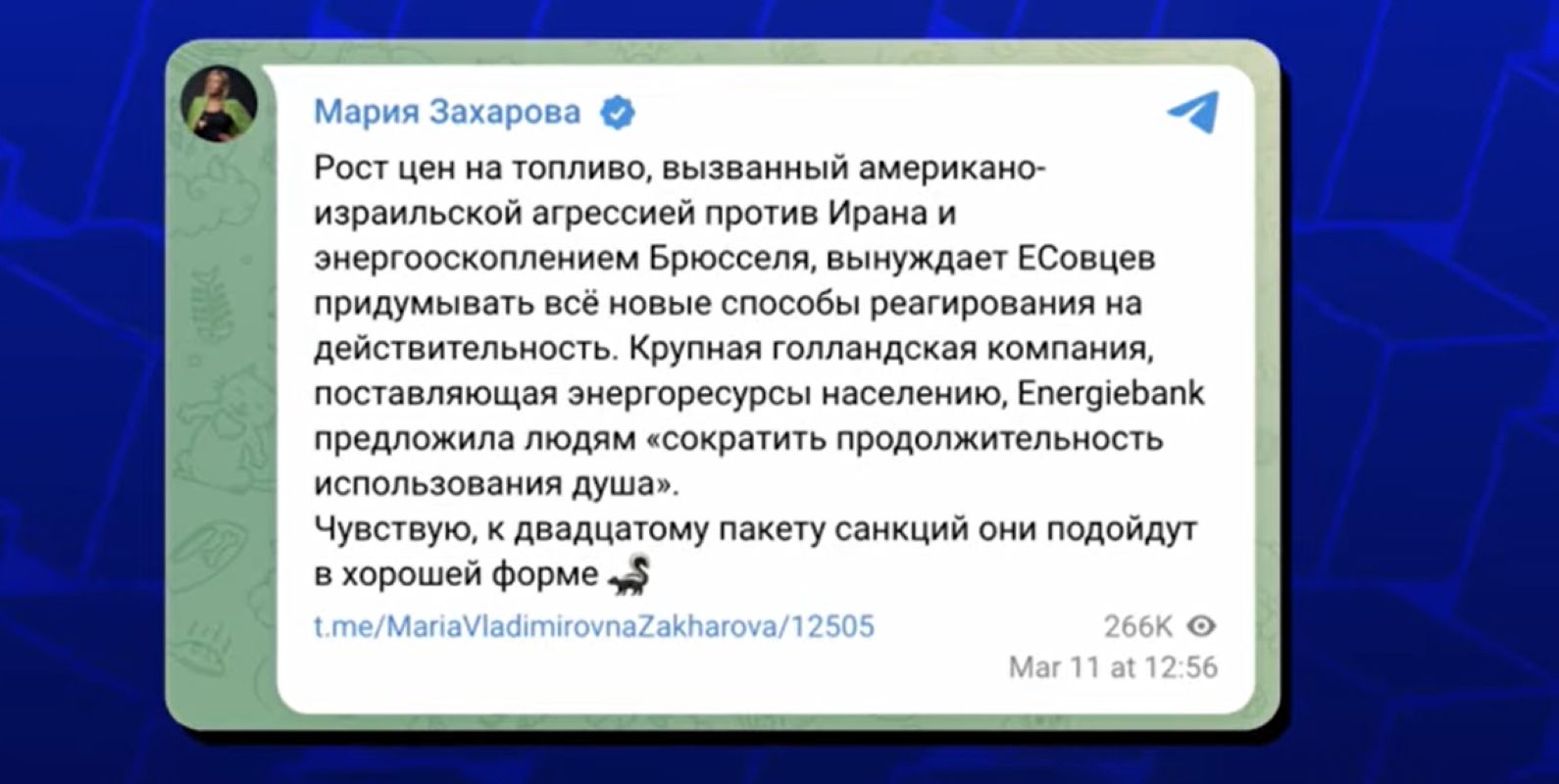 Додека Европската Унија ги зајакнува своите енергетски капацитети, руската дипломатија продолжува со обидите да го прикаже европскиот континент како жртва на сопствените санкции. Портпаролката на руското Министерство за надворешни работи, Марија Захарова, неодамна ја обвини ЕУ за „самокастрација“, тврдејќи дека отфрлањето на руските енергенси предизвикало непоправлива криза.