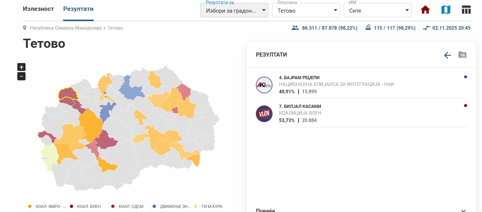 По затворањето на избирачките места и првите резултати а од избирачките одбори, коалицијата ВЛЕН вечерва прогласи победа во Тетово. Поддржувачите излегоа на улиците со знамиња и сирени, додека од штабот пристигна порака за мирно славење и почитување на јавниот ред.