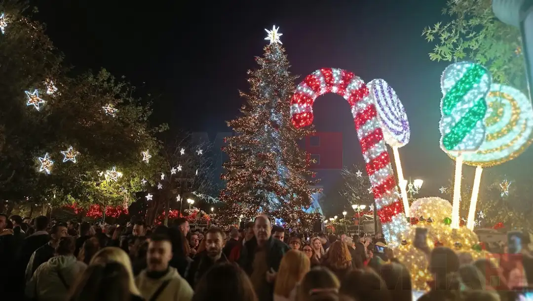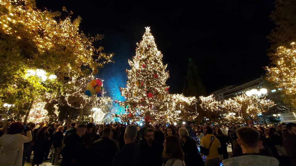 Осветлувањето на 19-метарската новогодишна елка, беше проследено со концерт на познат грчки пејач, а Грците, на сите возрасти, опремени со чадори се забавуваа неколку часа.