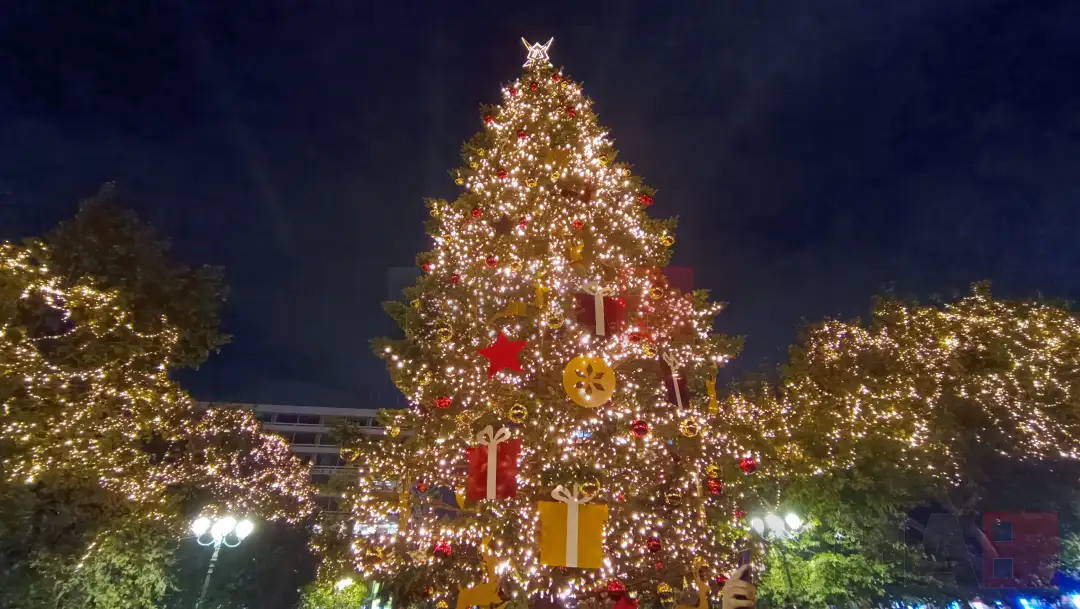 Осветлувањето на 19-метарската новогодишна елка, беше проследено со концерт на познат грчки пејач, а Грците, на сите возрасти, опремени со чадори се забавуваа неколку часа.