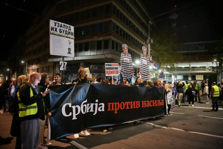 Вечерашниот протест се одвива со блокада на централните белградски улици, долж таканаречената „медиумска рута“ од Народното собрание до зградата на РЕМ и на РТС.
