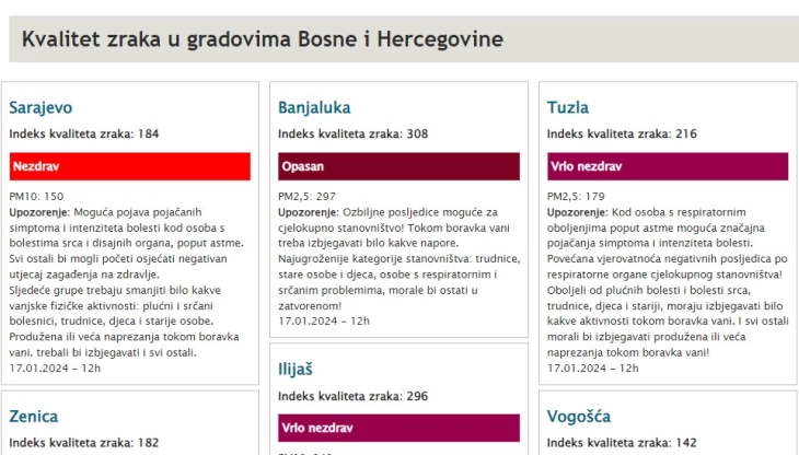 Во десетина градови во Босна и Херцеговина воздухот денеска е нездрав, а во некои опасен по здравјето, што е последица на користењето јаглен за греење и за производство на струја во голем број термоелектрани, па жителите се повикуваат што е можно помалку да бидат на отворено.