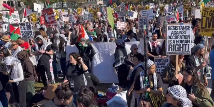 – Поддржувачите на Палестинците денеска во Вашингтон одржаа протест, при што скандираа „Интифада, интифада, интифада“.